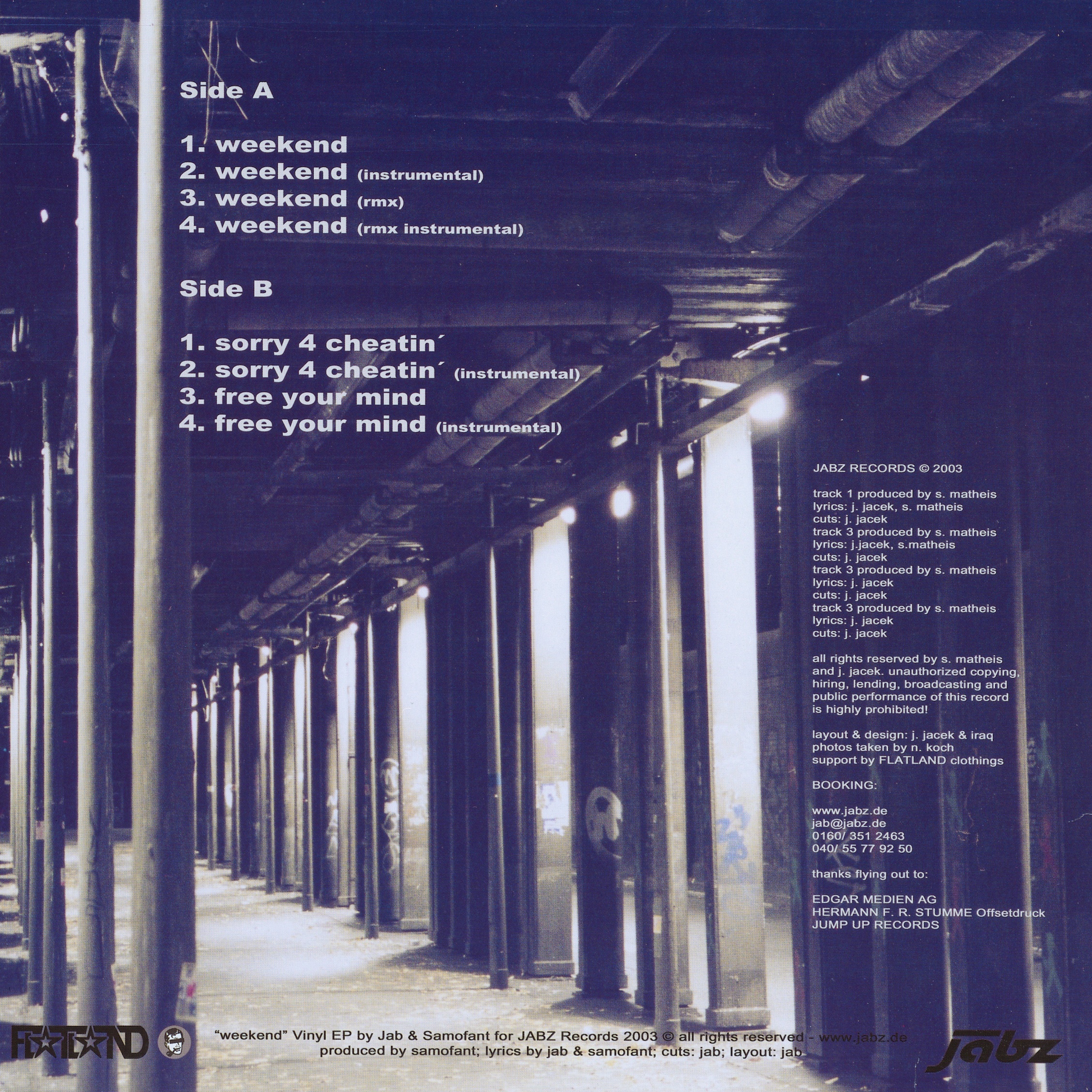 | A2 | Jab & Samofant Produced by: Samofant | Weekend (Instrumental) Start: n/a Duration: 04:55 BPM: 97.4 | 2003 |